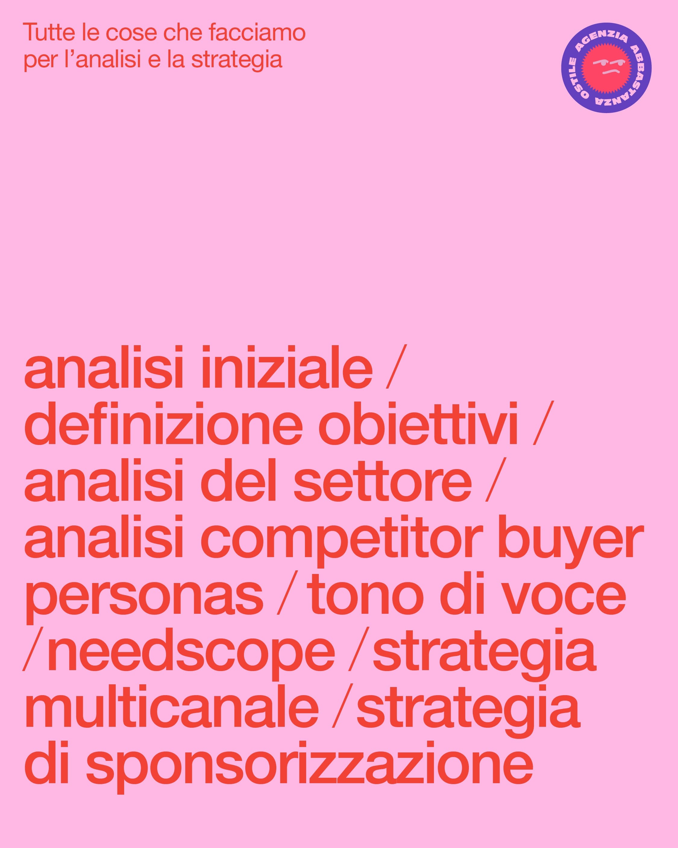 Elaboreremo un documento con tutto quello che ci serve per iniziare a lavorare: analisi iniziale (obiettivi, settore, contenuti, tono di voce, competitor, needscope, naming, ecc.), strategia multicanale e strategia di sponsorizzazione.